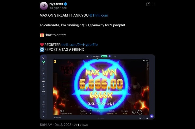 - HyperEfe wins 6,666x max payout at Thrill Casino.